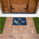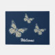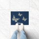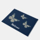 Padrões inspirados pelos mosaicos e designs judeus tradicionais decoram as asas, o corpo e as antenas desta borboleta monarca. "Paz" escrita em um roteiro aramaico se senta nos pontos das asas. Personalize o texto neste tapete de porta para criar uma decoração personalizada para a sua entrada.