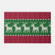 É um suéter tecido num impressão! Um padrão ricamente detalhado, com renas brancas a flutuar sobre um campo de verde cercado por um vermelho de Natal com embelezamentos brancos.
