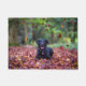 Labrador preto deitado entre folhas autóctones castanhas, amarelas e laranja, com folhas caindo pelo ar