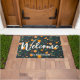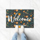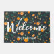 Laranjas, flores de laranja, e padrão foliar este sofisticado tapete botânico de boas-vindas. A palavra "bem-vindo" é varrida com ousadia em letras brancas grossas acima do nome personalizado de sua família por baixo. O fundo é um azul de carvão escuro contrastante e elegante. Esta porta é uma escolha perfeita para primavera ou decoração de verão.