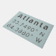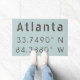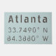coordenadas do mapa de latitude e longitude de Atlanta, GA em fonte cinza estilo industrial moderno sobre fundo azul claro.