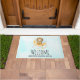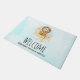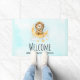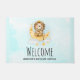 Uma porta bem-vinda com uma ilustração de aquarela fofa. Um adorável leão vestindo uma coroa pescando estrelas sentadas em uma lua crescente descansando em uma nuvem fofinha. Ilustração de fantasia mágica. Fundo de aquarela azul claro.