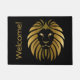 Um grande cheio de silhueta de leão de ouro adorna esta majestosa porta em qualquer cor de fundo que você escolher com texto opcional de boas-vindas! Adicione um estilo elegante à sua entrada com este tapete de porta e trate sua casa com algo especial hoje!