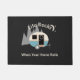 Campier portmat com o slogan inspiracional "Life Rocks When Your Home Rolls", que pode ser editado para suas próprias palavras. Impresso em fundo negro de um trailer viagem em azul e creme, em azul, sob a lua e as estrelas. Veja mais nesta coleção em Camp_and_Cottage no Zazzle.