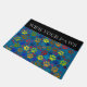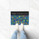 Um doormat colorido para que os proprietários do gato dêem a visitantes as patas para o pensamento com um teste padrão da pata do gato imprime nos lotes de incluir diferente das cores vermelho, alaranjado, verde, amarelo e marrom, em um fundo azul. É acima a ordem "limpeza suas patas na rotulação branca em um painel preto. Você pode mudar o slogan, a pia batismal e a cor azul do fundo ao terno com o botão da personalização. A esteira de porta seria o presente perfeito para uma casa ou um housewarming novo para amigos loving felinos e família.