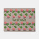 Lindas rosas rosa no tapete da porta bege. O texto de boas-vindas pode ser personalizado.