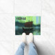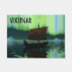 Uma imagem ligeiramente estilizada de um navio de longa distância Viking navegando à noite sob as Luzes do Norte ali um casal de icebergs; a maioria da tripulação está dormindo. A leitura de texto "VIKINGAR" (Vikings) também é exibida.