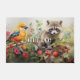 Imagem bonita de um guaxinim sentado em uma cerca de jardim com seu amigo, o Finch Amarelo, a cerca é coberta de flores, bagas e maçãs. O texto diz "Olá", mas você pode mudar para qualquer coisa que quiser. Conteúdo #generativo