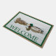 Dois patos Mallard, um ralo e uma fêmea, natação juntos em uma lagoa do Alasca. A leitura de texto, "WELCOME" também é exibida. O Mallard, Anas platyrhynchos, reproduz-se nas Américas temperadas e subtropicais, na Europa, na Ásia e no Norte de África, e foi introduzido na Nova Zelândia e na Austrália. Os pássaros machos têm uma cabeça verde ou azul clara, enquanto a fêmea é marrom-claro. O gregário Mallard vive em zonas úmidas e come plantas aquáticas. O Mallard é o ancestral da maioria dos patos domésticos. O Mallard foi uma das muitas espécies de aves originalmente descritas por Lineu em seu trabalho do século 18, Systema Naturae, e ainda tem o primeiro nome binomial que lhe foi dado. O nome deriva do velho "dreno selvagem" francês ou mallart, embora sua derivação final não seja clara. Pode estar relacionado com um nome próprio do Velho Alto Alemão, Madelhart, pistas deitadas nas formas alternativas em inglês "maudelard" ou "mawdelard". Os machos se cruzam frequentemente com os parentes mais próximos do gênero Anas, como o Pato Negro norte-americano, e também com espécies mais aparentadas, por exemplo o Norte Pintail, levando a vários híbridos que podem ser totalmente férteis. Isso é bastante incomum, e indica que o Mallard evoluiu muito rapidamente durante o Pleistoceno tardio. As larvas parecem estar mais próximas de seus parentes indo-Pacífico do que de seus parentes americanos julgando pela biogeografia. Considerando os dados de sequências de mtDNA D, eles podem ter evoluído mais provavelmente do que não na área geral da Sibéria; preferencialmentes de ossos de Mallard aparecem bruscamente em restos de comidas de humanos antigos e outros depósitos de ossos fósseis na Europa, sem um bom candidato a uma espécie predecessora local. yrhynchos palaeoboschas. O Mallard tem de 20 a 26 polegadas (do qual o corpo forma cerca de dois terços), tem uma envergadura de asas de 32 a 39 polegadas e pesa 1,6 a 3,5 lb. O tamanho do Mallard varia clinicamente, e as aves da Groelândia, embora maiores do que as aves para o sul, têm notas menores e são mais armazenadas. Por vezes é separado como subespécie, a Groelândia Mallard (A. p. conboschas). O Mallard é um raro exemplo tanto da Regra de Allen como da Regra de Bergmann nas aves. Bergmann's Rule, que afirma que as formas polares tendem a ser maiores do que as relacionadas com climas mais quentes, tem numerosos exemplos em aves. A Regra de Allen diz que apêndices como ouvidos tendem a ser menores em formas polares para minimizar a perda de calor, e maiores em equivalentes tropicais e desérticos para facilitar a difusão de calor, e que os taxa polares estão mais armazenados no geral. Exemplos dessa regra em aves são raros, por falta de ouvidos externos. No entanto, a lista de patos é muito bem fornecida com vasos sanguíneos e é vulnerável ao frio. Os machos reprodutores são inconfundíveis, com uma cabeça brilhante verde-garrafa, uma extremidade preta traseira e uma laranja amarelada (também pode conter algum vermelho) pontas com preto (em oposição à lista negra/laranja nas fêmeas). Eles têm uma coleira branca que demarca a cabeça do peito marrom-formigado, asas marrons de cinza e uma barriga de cinza pálida. A cauda escura tem bordas brancas. A fêmea de Mallard é marrom-claro malhado, como a maioria dos patos borbulhantes fêmeas, e tem bochechas, sobrancelha, garganta e pescoço com uma coroa mais escura e faixa de olhos. Na eclosão, a coloração plumada do patinho é amarela na parte inferior e na face (com listras pelos olhos) e preta na parte de trás (com algumas manchas amarelas) até o topo e a parte de trás da cabeça. Suas pernas e o caroço também são pretos. Por se aproximar de um mês de idade, a plumagem dos patinhos passará a ser bárbara, parecendo-se mais com a fêmea (embora sua plumagem esteja mais nua) e suas pernas perderes a coloração das cinzas escuras. Dois meses após a eclosão, o período de repouso terminou e o patinho é agora juvenil. Entre três e quatro meses de idade, o jovem pode finalmente começar a voar à medida que suas asas são totalmente desenvolvidas para o voo (o que pode ser confirmado pela visão de penas de espetáculo púrpura). O seu projeto de lei irá, em breve, perder a coloração escura das cinzas e se é macho ou fêmea pode finalmente ser distinguido por três fatores. A coloração das letras é amarela em machos, preta e laranja para fêmeas. As penas são castanhas-avermelhadas para machos, castanhas para fêmeas. A pena de rabo-do-centro das aves masculinas (chamada de pena sacada) é curvada; as fêmeas têm penas de hetero. Durante o último período de maturidade até a idade adulta (6-10 meses de idade), a plumagem de jovens do sexo feminino permanece a mesma enquanto a plumagem de jovens do sexo masculino lentamente muda para suas cores reconhecíveis. Esta alteração da plumagem aplica-se igualmente aos machos adultos do tipo Mallard quando transitam para dentro e para fora da sua plumagem não reprodutora (eclipse) no início e no final do período de muda de Verão. A idade adulta dos Mallards é de 14 meses e a expectativa média de vida é de 20 anos. Uma espécie ruidosa, o macho tem um chamado nasal, e um apito agudo, enquanto a fêmea tem um quack mais profundo estereotipicamente associado a patos. O Mallard é amplamente distribuído pelo hemisfério Norte, América do Norte, do sul e centro do Alasca ao México, ilhas havaianas, e pela Eurásia, da Islândia e do sul da Groenlândia e partes de Marrocos (Norte de África) no oeste, Escandinávia ao norte, e à Sibéria, Japão e China no leste. É fortemente migratória nas partes nortes da sua área de reprodução, e invernos mais a sul. Na América do Norte, por exemplo, inverte-se para o Sul, para o México, mas também invade regularmente a América Central e o Caribe entre setembro e maio. O Mallard habita uma vasta gama de habitats e clim