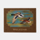 Patos-reais masculinos e femininos em voo sobre uma lagoa de ouro, água ondulando para refletir as cores da folhagem de outono de fundo brilhando à luz do sol, tudo sobre um fundo castanho tônico na terra.