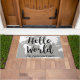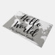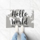 Silhueta branca do mapa do mundo com o mundo da frase "olá!" na rotulação corajosa da mão preta. Igualmente tem seu nome de família personalizado no centro inferior.