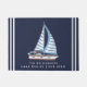 Porta moderna do lago personalizada com nome de família e ano personalizados e decorada com um veleiro com velas azuis e listras brancas. O modelo facilita a digitação do seu nome de família, ano ou outro texto.
