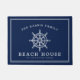 Um tapete marinho e branco de boas-vindas adaptado ao orgulhoso proprietário da casa de praia. Apresenta uma roda de safra náutica seguida do nome da família acima e da data e local de ensaio abaixo.