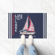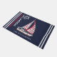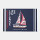 Porta única de casa de lago personalizada com seu nome familiar e decorada com um veleiro com velas vermelhas, listras e o ditado "A vida é melhor no lago." O modelo facilita o digitar seu nome, um nome de barco ou outro texto. Este design foi ajustado para uma porta de tamanho médio (24x36 pol). Para obter uma versão menor, visite esta página: https://www.zazzle.com/nautical_boat_navy_blue_life_is_better_at_the_lake_doormat-256844354864143485 Obrigados!