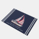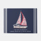 Portão exclusivo da casa do lago personalizado com seu nome familiar e decorado com um veleiro com velas e listras vermelhas. O modelo facilita a digitação do seu nome de família, ano ou outro texto.
