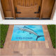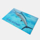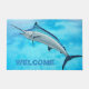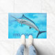 Porta azul com fundo de água azul e texto "bem-vindo". Um peixe grande é a imagem em porteiros que vêm em dois tamanhos. O texto "Bem-vindo" é impresso na parte inferior e pode ser alterado ou excluído. Outra fonte pode ser escolhida na área "personalizar mais".