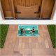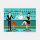 Cada hora é feliz com este tapete da porta do coquetel retrô. O design moderno do meio século apresenta um vibrante estilo, minimalista, de 1960 desenho de um bar de cocktail clássico. Contra o pano de fundo de uma parede aqua, podemos ver filas de óculos de bebida. Pelo menos podemos ver os teais silhuetas de óculos de bebida. A julgar pelas formas do material, este bar está bem equipado para molhar o assobio, seja qual for a sua preferência pela bebida. Um barman mais competente e personável é manejar o bar com sotaques amarelos. O jovem barman está vestindo uma camisa branca e primitiva com gravata arco preta. Sua boa aparência, cabelo louro e óculos de hipster pretos nos dão todas as razões para acreditar que ele passa seus dias como um ator em luta ou um super-herói. Por um lado, o bonito mixologista está entregando um martini a um cliente do lado oposto do bar. O cliente que espera é um cavalheiro de ombros largos com um terno preto e gravata vermelha. Ele é o tipo de sujeito que é descrito como alto, escuro e bonito mesmo quando ainda é horas até a hora de fechar. Parece que há um banco de bares vermelho e cromo com o nome do Sr. Debonair. No entanto, para não ser presunçoso, ele pergunta, "Desculpe-me. Este assento está ocupado?" Ele está perguntando à garota cabeleira no banco de bares vizinho. Ela é do tipo "garota ao lado", se você vive ao lado de uma beleza perfeita com uma figura que não desiste. Ela está vestindo um vestido preto e segurando um martini em uma mão. Ela espera que ela e o cavalheiro que se aproxima tenham mais em comum que a sua preferência pela bebida e a escolha da cor da roupa. Parece que esta noite ficou interessante. Saúde para você!