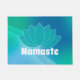 Matriz de porta temática de ioga feita em uma espiral de gradiente azul a verde, com uma silhueta de flor de lótus branca e aqua, no meio. O texto branco em negrito diz Namaste (uma saudação hindu) e pode ser alterado para ler o que você deseja.