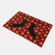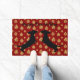Comece seu feriado decorando com este fabuloso tapete de boas-vindas do Feliz Dox Holiday, rico e vermelho, com bolas de árvore de ouro completas com dois pratos de silhueta preta empolgados prontos para comemorar a temporada de festas. Personalize com seu próprio texto ou deixe como está!