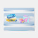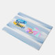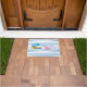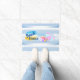 Um tapete de porta em design da Casa Azul de Praia com balde de areia e bola de praia.