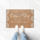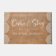 Um tapete de porta de 24 x 36" moderno para caligrafia que realmente nos faz sentir bem-vindos. Um presente de excelente para recém-casados ou novos donos de casa, nosso costume vem e fica à porta em uma luva elegante e apresenta "Venha e Fique" em um moderno e elegante roteiro de caligrafia manuscrito. Personalize com o seu nome familiar em letras brancas clássicas. Projetado para você pelo Blackberry Boulevard.