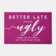 Saudações aos seus hóspedes com humor e estilo usando esta garota, engraçada Doormat de Boas-vindas. Apresentando uma fonte branca moderna em um fundo na moda magenta, a mensagem lúdica "Melhor Tarde do que Feia" adiciona uma reviravolta divertida a qualquer entrada. Esta porta personalizável permite personalizá-la com seu próprio texto, como seu endereço ou qualquer mensagem que você gostaria de exibir. Perfeito por adicionar um toque único e acolhedor à decoração da sua casa enquanto cria uma atmosfera amigável. Uma forma prática e na moda para saudar os visitantes, este tapete personalizado de boas-vindas é um presente ideal para os rebanhos domésticos ou qualquer ocasião.