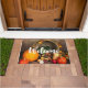 Uma porta de boas-vindas com uma fotografia de uma colheita de Ação de Graças, colocada numa mesa de madeira rústica. Abóbora, batatas, abóbora, etc... constituem esta bela coleção de comidas. Folhas coloridas do outono rodeiam a cesta da cornucopia.
