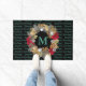 Preto decorativo moderno com a coroa de Natal VERDE MINT DOORMAT com MONOGRAMA personalizável no centro para que você possa substituí-la pela sua própria coroa inicial. Em segundo plano, há uma mensagem em série que diz: "A SAÍDA DA SEASON". Outros itens e cores correspondentes estão disponíveis nas Coleções CHRISTMAS por Designs Bereanos.