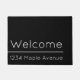 Esta porta preta tem um texto branco que pode editar para mostrar o seu endereço de rua. Bem-vindo está acima de uma linha horizontal e texto para seu endereço de rua.