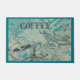 Modern sketched design of a steaming coffee cup next to a coffee grinder with an abstract blue background.