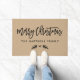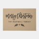 Add a touch of elegance to your holiday porch decor with this stylish Merry Christmas doormat. Design features script writing and accents of branches with holly leaves and berries. Personalize with your family's last name monogram. Includes a rustic neutral tan textured background.