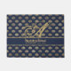 Um presente de casamento elegante para recém-casados, com seu apelido monograma como carta de caligrafia, seus primeiros nomes e a data do casamento. O tema é marinho azul com um padrão de casca de ouro estilo de deco.
