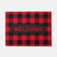 Este tapete apresenta o cheque de búfalo preto e vermelho com um nome de família de monograma vermelho e texto de "bem-vindo" em um fundo preto falso personalize com seu próprio nome ou para dar como presente.