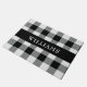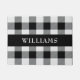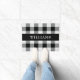 Este doormat preto e branco clássico do teste padrão da verificação do búfalo tem uma tira preta através do centro com um nome de família no texto branco. Personalize com seu próprio nome ou para dar como um presente.