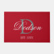 Data Elegante do Monograma Vermelho Estabelecida Porta Concebida com fundo vermelho escuro personalizável e monograma de cinza clara no centro. Personalizado com o sobrenome em caracteres de script clássico de caligrafia branca e ano estabelecido em números brancos no centro frontal inferior. Faz uma ideia excelente de lar ou de presente de chá de panela.