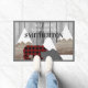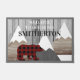 Um tapete de porta com um design rústico de montanhas cobertas de neve, um xadrez de búfalos/urso de checagem, e personalizado com uma mensagem de boas-vindas e seu nome familiar. Perfeito para sua casa de montanha ou aluguel de férias.