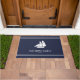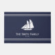 Um veleiro branco está no centro de uma porta azul da meia-noite. Sob o barco, há duas linhas para seu texto personalizado. O texto é branco. Todo o texto pode ser editado ou excluído.