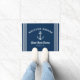 Nautical "Welcome Aboard" boat mat design features a simple, stylish navy blue and white coastal style design with boat anchor accent. Personalize the custom text with the name of your boat along with her location city and state. Makes a great boating themed gift for boat owners.