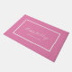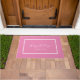Noivos felizes modernos fazem uma porta com um script branco em um fundo rosa. Personalize com seu nome de família ou texto.