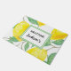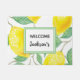 Limões suculentos, deliciosos e de cor aquosa em amarelo, verde e pano de fundo branco. Um quadro branco e verde com modelos para um nome de família. O nome é escrito em um script de estilo manuscrito, letras negras. Com o texto: Bem-vindo