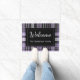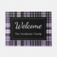 Design de xadrez de púrpura com um texto que lê Bem-vindo e opção para adicionar seu nome de família personalizado.