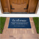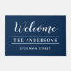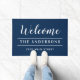 A porta personalizada Elegante e eterno apresenta "Bem-vindo" no script de caligrafia escrevendo com o sobrenome da sua família e o endereço de rua da sua casa personalizado em branco com sotaques simples de faixa. Nota, o fundo azul do marinho e as cores de texto branco podem ser modificados para coordenar com a sua varanda ou decoração de entrada.