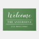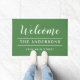 A porta personalizada Elegante e eterno apresenta "Bem-vindo" no script de caligrafia escrevendo com o sobrenome da sua família e o endereço de rua da sua casa personalizado em branco com sotaques simples de faixa. Nota, as cores de fundo verde foliar e de texto branco podem ser modificadas para coordenar com a sua varanda ou decoração de entrada.