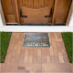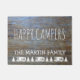 O presente de acampamento rústico bonito da decoração do rv para rvers, casais aposentados, e campistas personalizados, doormat de madeira afligido do olhar leu os campistas felizes em vista escrita à mão, letras brancas com um modelo do texto para adicionar o nome de família abaixo em letras lunáticas. Com uma beira bonito, branca na parte inferior do motorhome RVs do vintage e os pinheiros. Contra um fundo real da foto da madeira rústica, afligida que é scarred e velha. O excelente acopla o presente da aposentadoria, demasiado. Seja direito em casa na frente de um rv ou de uma cabana rústica de madeira acolhedor.