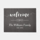 Esteira bem-vinda com um fundo de madeira do falso, uma pia batismal branca bonito da caligrafia, e seus nome e ano de família estabelecidos.