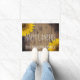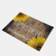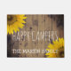 O presente home floral da decoração do país rústico para casais, rvers, viajantes, jardineiro, caminhantes, campistas, e amantes de natureza aposentados é este doormat personalizado que lê "campistas felizes" em olhar escrito à mão, rotulação branca do olhar do barnwood com um modelo para adicionar o nome de família abaixo nas letras brancas, lunáticas. Contra um fundo das pranchas de madeira rústicas, afligidas com knotholes e escurecidas em torno das bordas. Os girassóis amarelos do país decoram oposto aos cantos. Presente bonito da aposentadoria e decoração floral do outono. Seja direito em casa na frente de um rv ou de uma cabana rústica de madeira acolhedor.