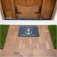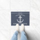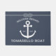 Adicione o nome do seu barco com âncora, corda, tipografia moderna e tapete de boas-vindas azul-marinho.