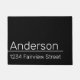 Esta porta preta tem texto branco que pode editar para mostrar o seu nome e endereço de rua. O nome está acima de uma linha horizontal. O texto para o seu endereço de rua está perto do fundo.