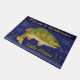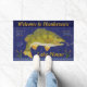 Este doormat legal, personalizado é perfeito para sua casa do lago. Mostra um desenho original de um peixe baixo aproximadamente para morder um gancho. O texto diz, "a casa do lago [seu nome] welcome." O design é feito nas máscaras de azul, de verde, de amarelo e de marrom e inclui uma beira da onda ao longo da parte inferior com cattails.