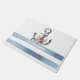 Esta imagem apresenta um nome de barco e ancora em um fundo listrado azul claro e branco.